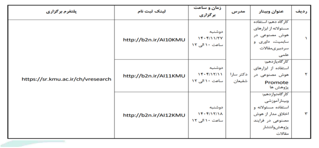 به اطلاع علاقمندان می رساند با عنایت به اهمیت توسعه دانش و آگاهی از ابزارهای هوش مصنوعی در تحقیقات و انتشارات علمی در ادامه سلسله وبینارهای توانمندسازی هوش مصنوعی در انتشارات علمی برای پژوهشگران مدیران و کارشناسان مرکز توسعه و هماهنگی انتشارات علمی با همکاری دانشگاه علوم پزشکی کرمان تاکنون ۹ وبینار با مشارکت و استقبال پرشور پژوهشگران کشور برگزار نموده است به منظور تکمیل محتوای آموزشی و آشنایی پژوهشگران با آخرین ابزارها و ملاحظات این حوزه سه دوره وبینار آتی تا پایان سال به شرح ذیل جهت اطلاع رسانی به کاربران و پژوهشگران اعلام می گردد.